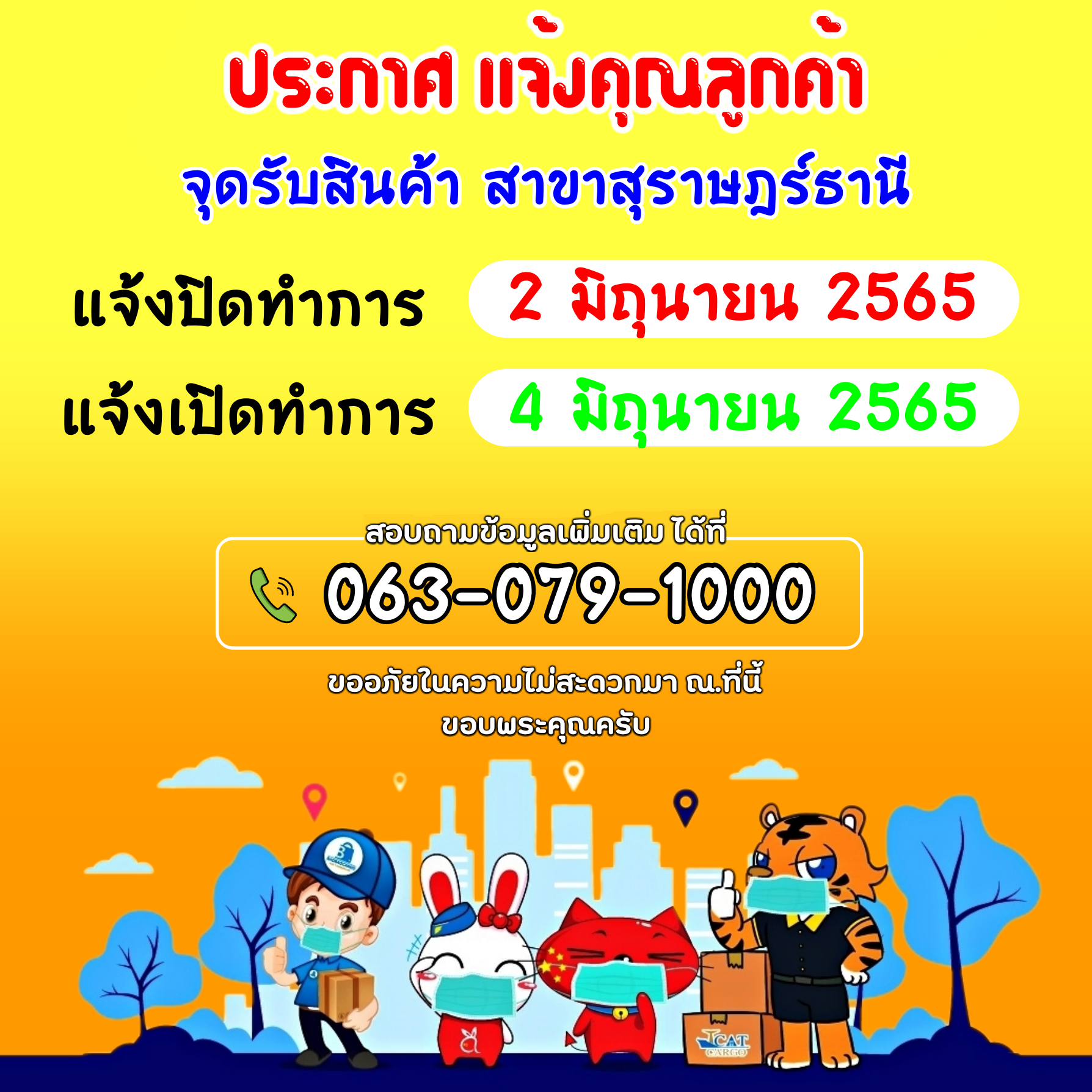 จุดรับสินค้า สาขาสุราษฎร์ธานีปิดทำการ 1 วัน...