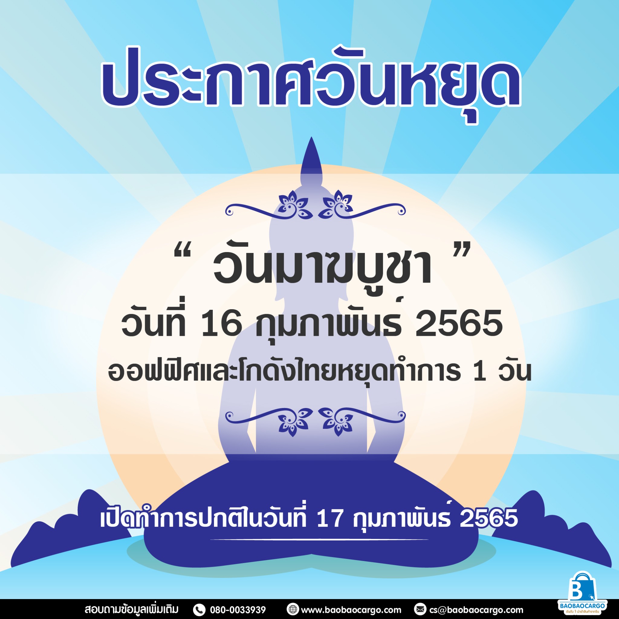 เนื่องในวันมาฆบูชาออฟฟิศและโกดังไทยหยุดทำการวันที่ 16 ก.พ. 65...