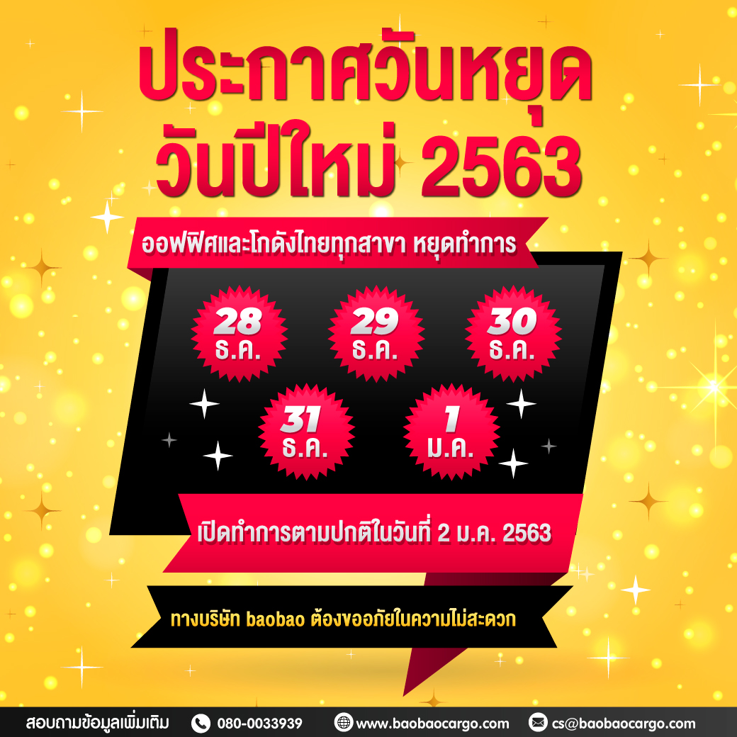 ออฟฟิศและโกดังไทยทุกสาขาหยุดทำการ วันที่ 28 ธันวาคม 2562 - 1 มกราคม 2563 เปิดทำ...