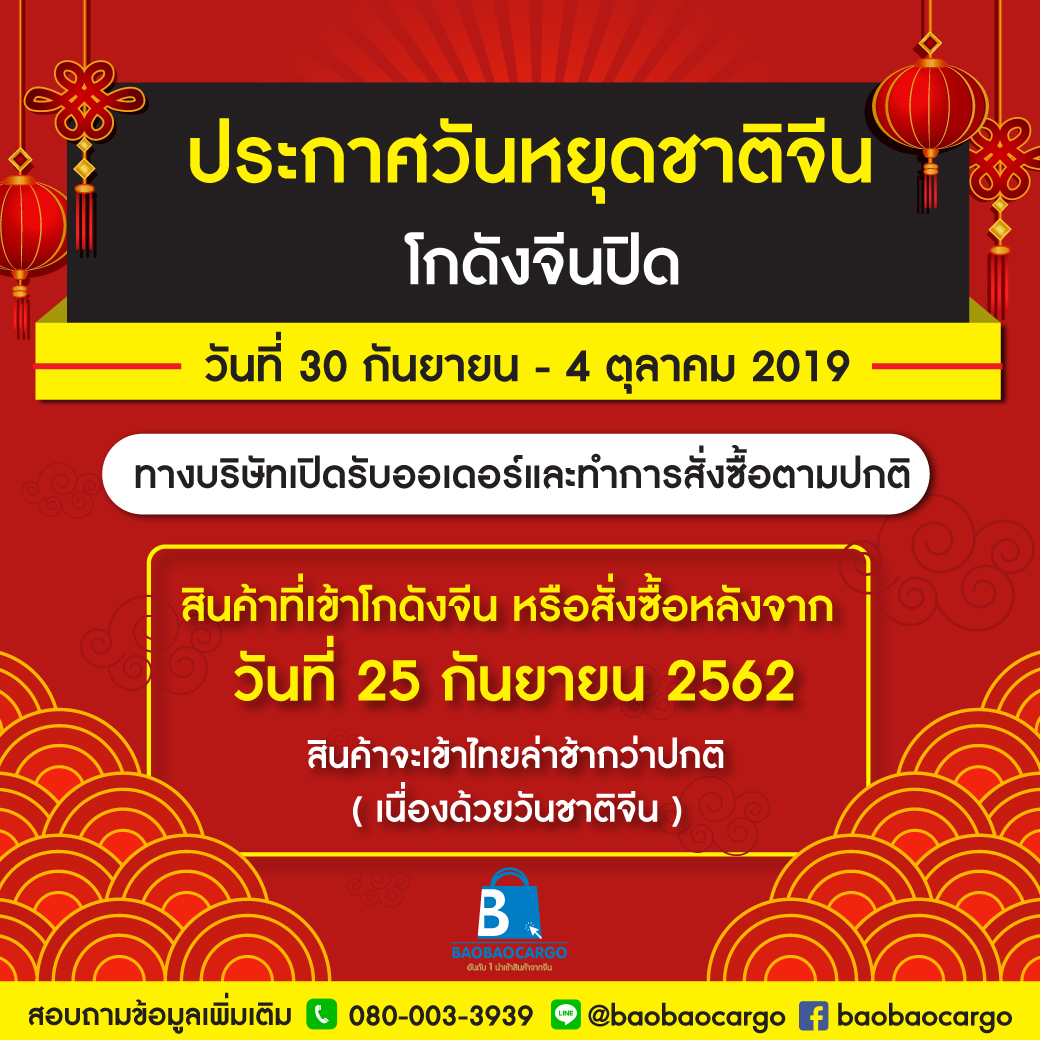 ประกาศวันหยุดชาติจีน โกดังจีนปิดทำการวันที่ 30 กันยายน ถึง 4 ตุลาคม 2562...