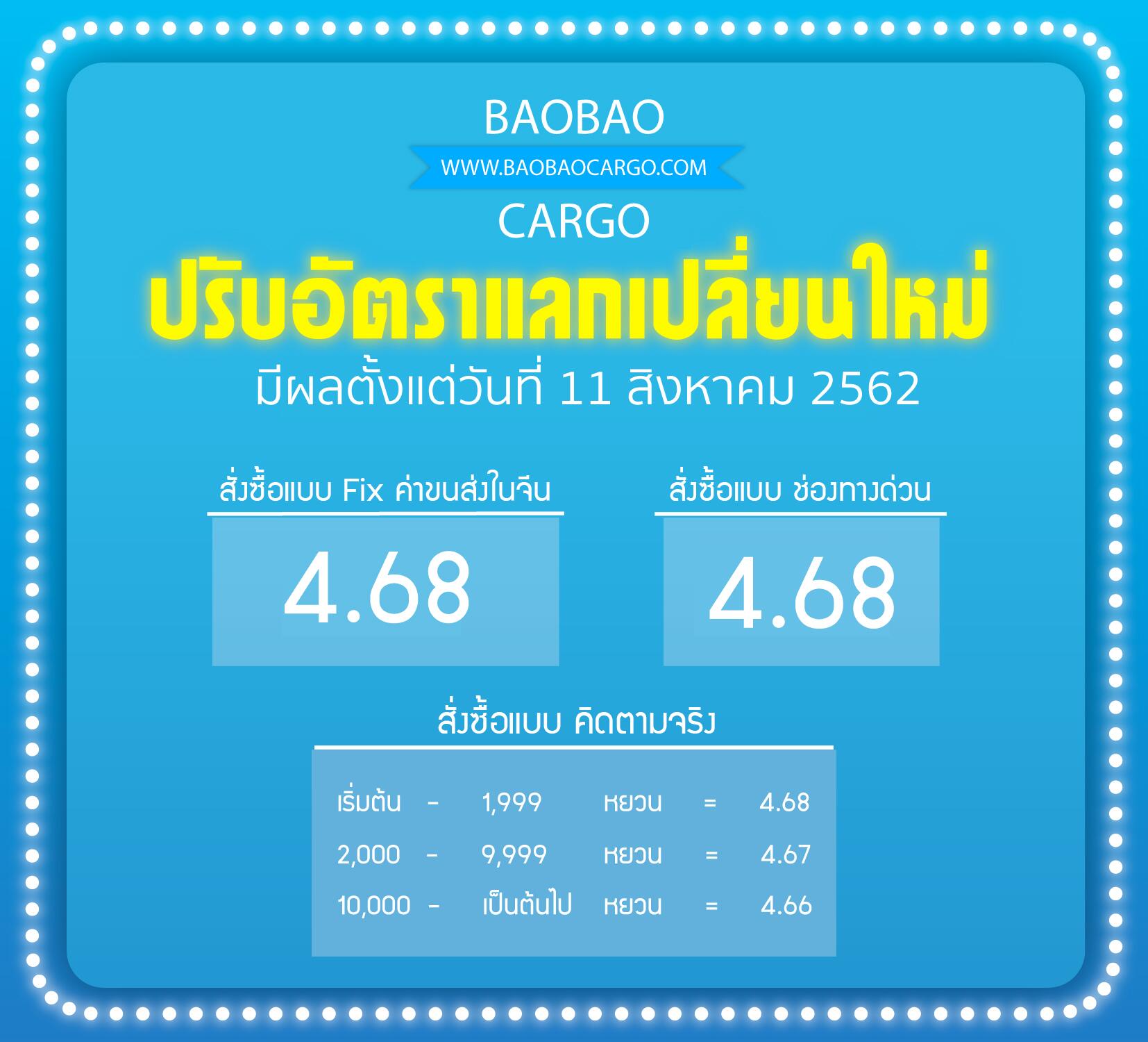 Baobaocargo แจ้งปรับอัตราแลกเปลี่ยนใหม่ มีผลตั้งแต่วันที่ 11 สิงหาคม 2562...