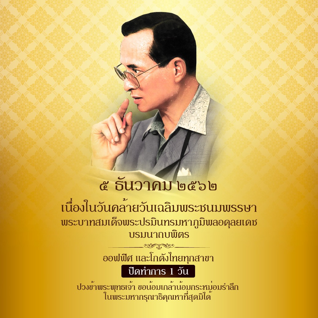 ประกาศวันหยุด วันที่ ๕ ธันวาคม ๒๕๖๒ เนื่องในวันคล้ายวันเฉลิมพระชนมพรรษา พระบาทสมเด็จพระปรมินทรมหาภูมิพลอดุลยเดชบรมนาถบพิตร