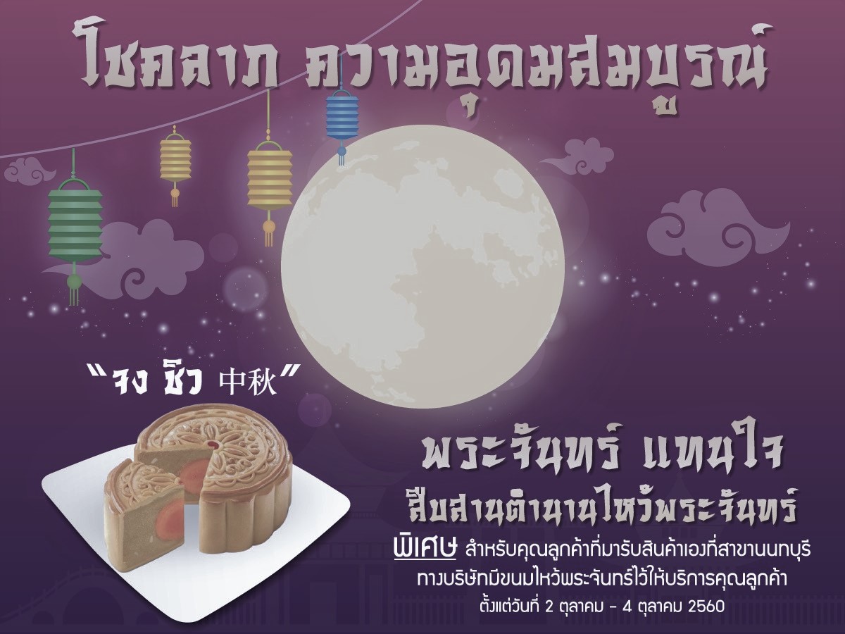 สำหรับคุณลูกค้าที่มารับสินค้าเองที่สาขานนทบุรี ทางบริษัทมีขนมไหว้พระจันทร์ไว้ให้บริการคุณลูกค้า ตั้งแต่วันที่ 2 ตุลาคม - 4 ตุลาคม 2560 นี้นะคะ