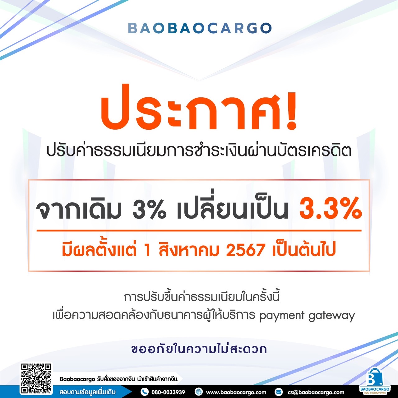 ประกาศ ปรับค่าธรรมเนียมการชำระเงินผ่านบัตรเครดิตเป็น 3.3%