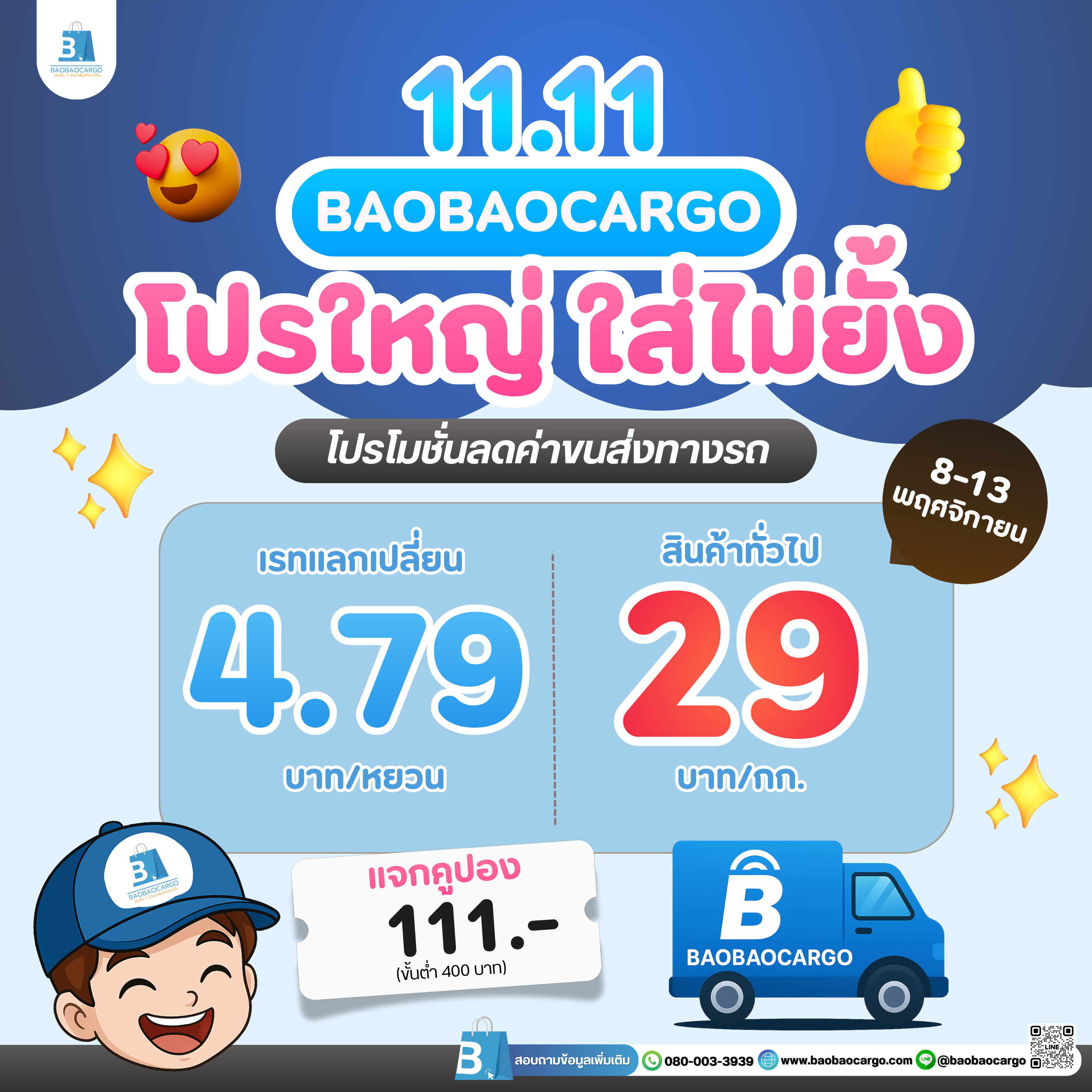 จะได้รับคูปองส่วนลดค่าขนส่ง จีน-ไทย 111 บาท (ค่าขนส่งจีน-ไทยขั้นต่ำ 400 บาท)