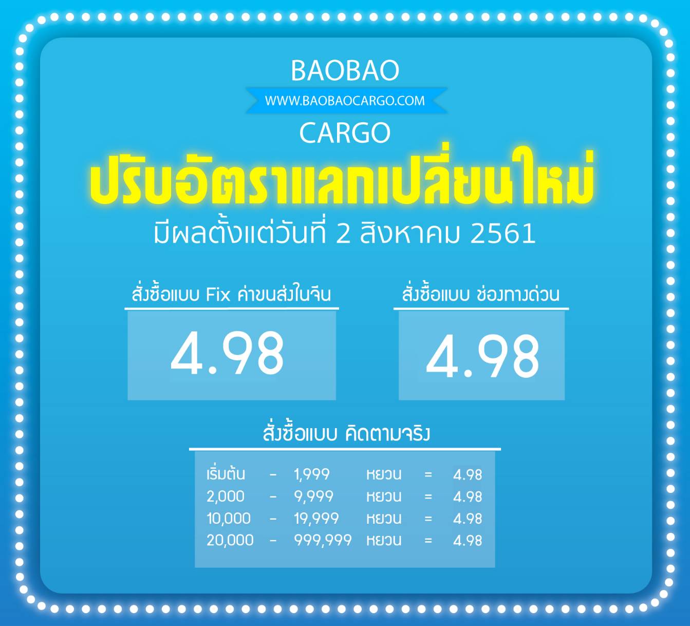 Baobaocargo แจ้งปรับอัตราแลกเปลี่ยนใหม่ มีผลตั้งแต่วันที่ 2 สิงหาคม 2561