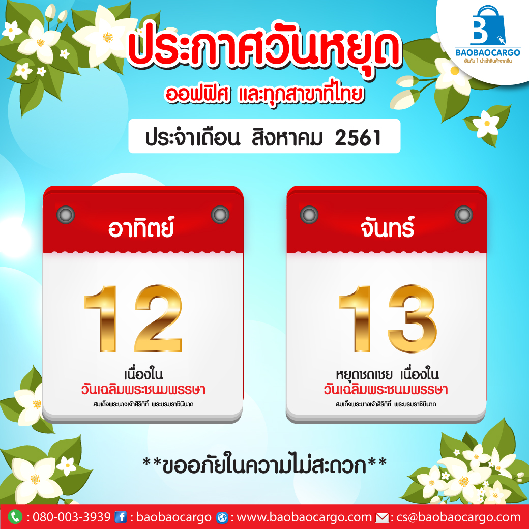 ประกาศวันหยุดนักขัตฤกษ์ในเดือน สิงหาคม 2561
