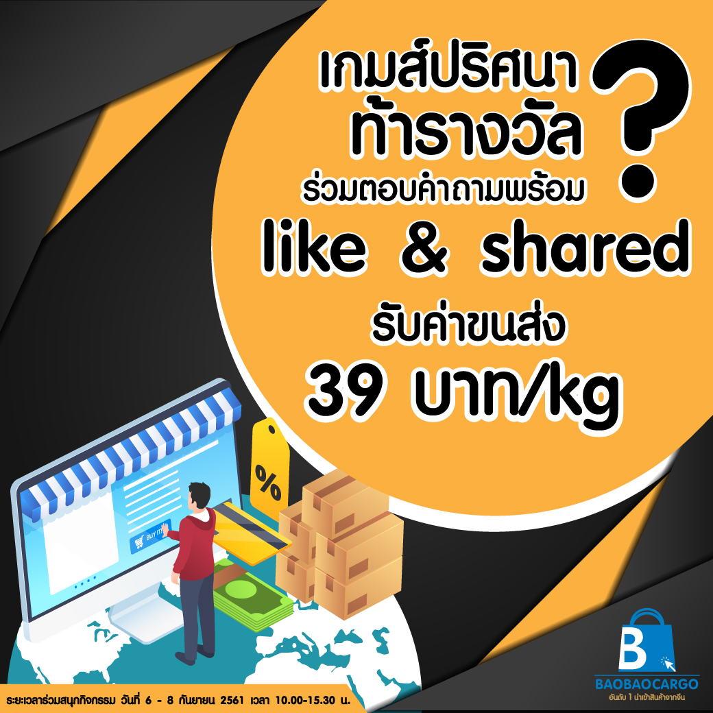 Baobaocargo ชวนคุณลูกค้าร่วมสนุกตอบคำถาม เพื่อรับค่าขนส่ง-จีนไทย ลดเหลือ 39บาท/กิโลกรัม