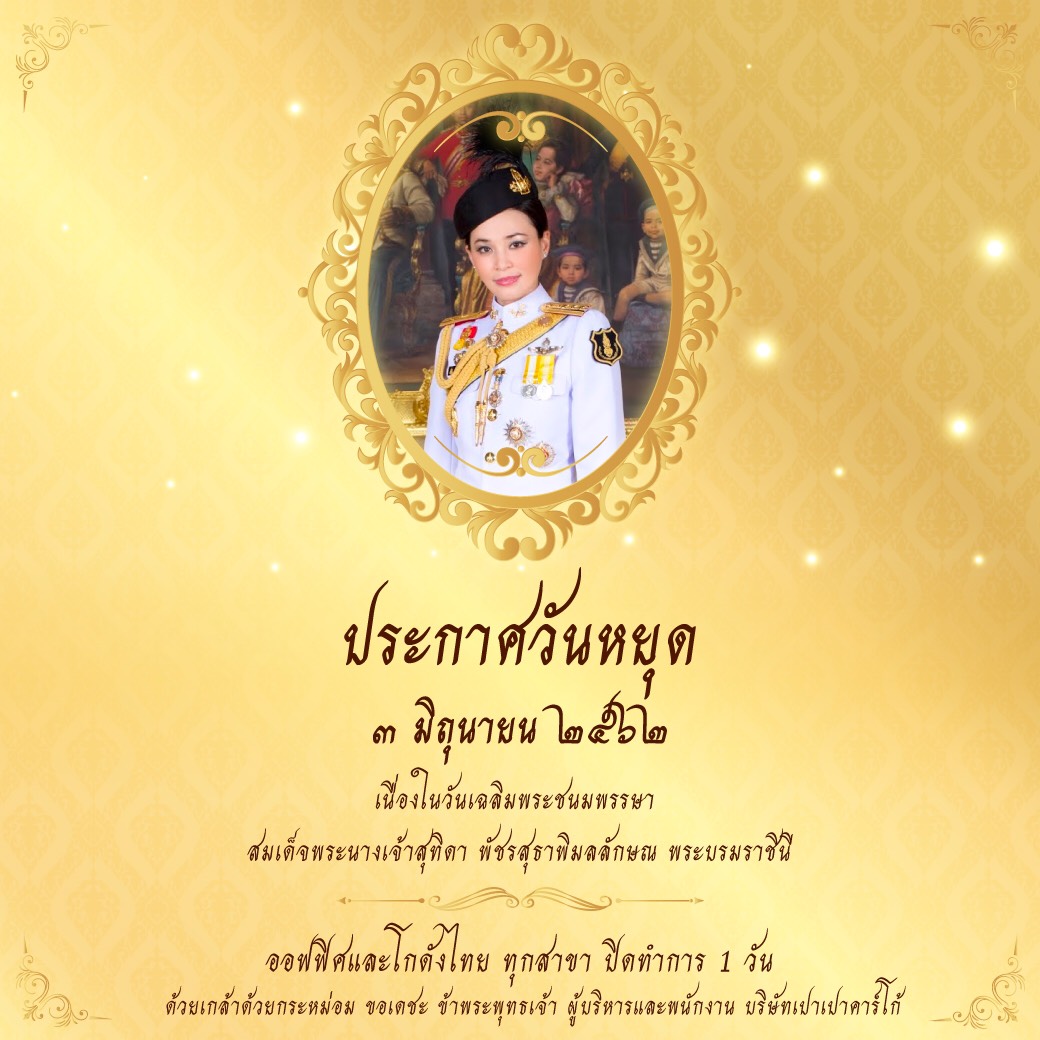 ประกาศวันหยุด 3 มิถุนายน 2562 "เนื่องในวันเฉลิมพระชนมพรรษาสมเด็จพระนางเจ้าสุทิดา พัชรสุธาพิมลลักษณ พระบรมราชินี"